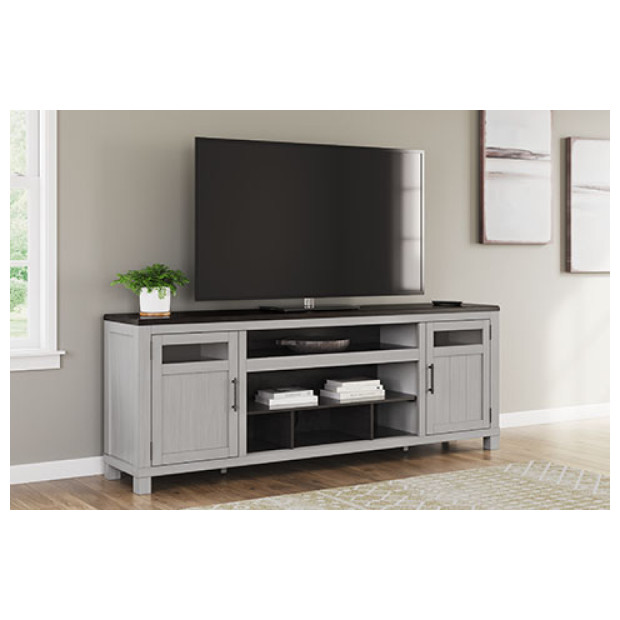 Make a farmhouse-inspired statement with this TV stand. It’s beautifully crafted to stand the test of time, with a planked effect and clean two-tone finish that lend a relaxing vintage feel. With two cabinets (each with an adjustable shelf) and an open cubby, it offers plenty of storage to house all of your electronic needs.