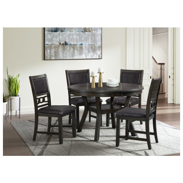The dark Amherst will be the heart of your entertaining ensemble in your dining space. Not only is it the spot where you serve up dinner party courses and festive family feasts, but it sets the aesthetic tone for your room and allows you to stage centerpieces that are all your own. This table features storage shelving on the base and link spired detailing on the chair backs. The contrasting upholstered seats complete this easy yet elegant look.