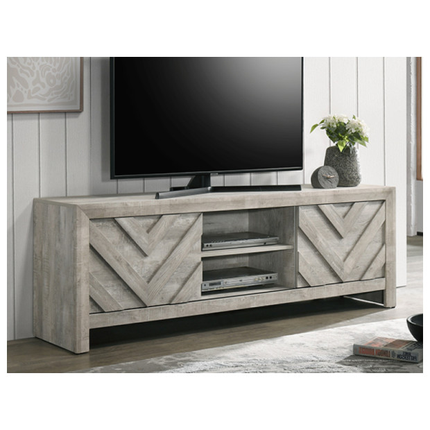 The Valor TV Stand will make a beautiful addition to your bedroom or actually any room in the house. It features two doors with chevron accents, two storage area, and comes in a light grey finish