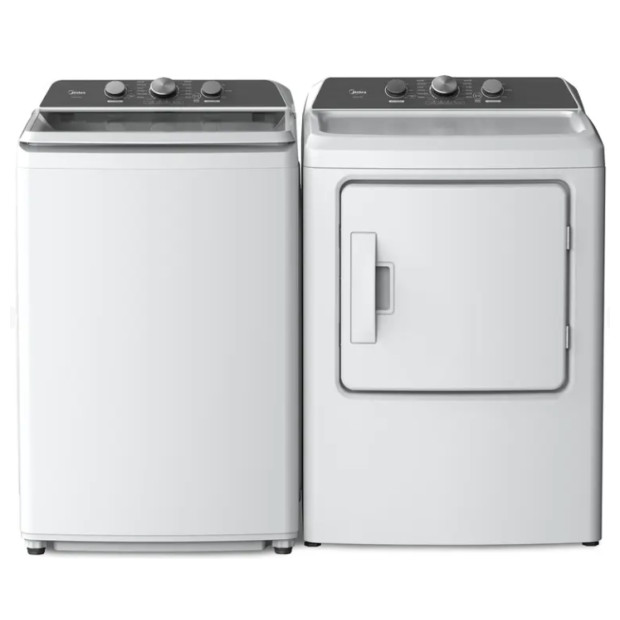 The Midea white laundry pair features a 4.1cf top load washer with glass lid and a power boost agitator to tackle tough stains. The 7cf dryer features sensor dry and a sanitize cycle.