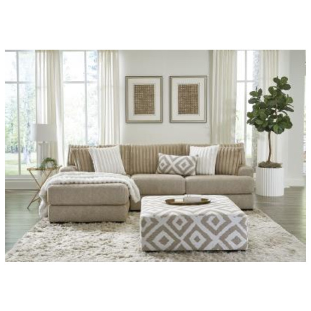 Effortlessly stylish and supremely comfortable, this chaise sectional in a neutral sand-tone fabric brings a relaxed yet refined vibe to any living room. The spacious design offers ample room to stretch out, while the plush back cushions and mix of decorative pillows—featuring textured stripes and modern geometric patterns—add a touch of elegance and warmth. With clean lines, low-profile arms, and sturdy block feet, this sectional is built for everyday lounging and timeless appeal. Ottoman not included.