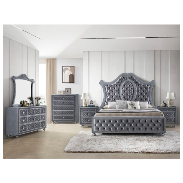 Indulge in the opulence and luxury of this exquisite bedroom collection, where classic glamour meets contemporary design. The grandeur of the tufted, upholstered headboard is framed by an elegantly sculpted silhouette, complemented by the plush finish that graces both the bed and the accompanying case pieces. Crystal accents and intricate patterning on the drawer fronts add a touch of sparkle and intricate detail, while the polished silver-tone handles and feet provide a striking contrast to the chic grey palette.