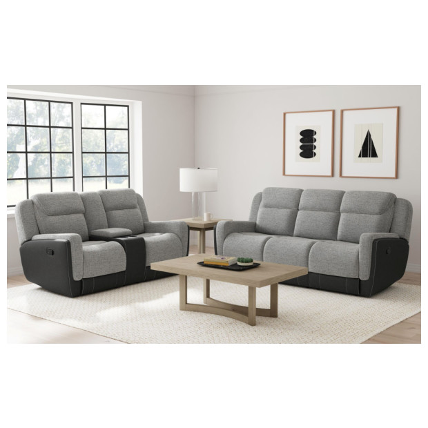 Introducing the Hornet Motion 2-Piece Living Room Set in Rancho Grey, a perfect combination of comfort and contemporary design that will transform your living space into an oasis of relaxation. This set includes a spacious reclining sofa and a matching reclining loveseat, each featuring a stylish grey fabric that seamlessly blends with any decor.