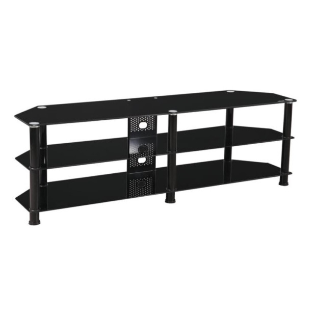 TV’s up to 79”. 8mm Glass Top Shelf. 5mm Glass Middle & Bottom Shelves. Black Tempered Glass. Aluminum Tube Legs.