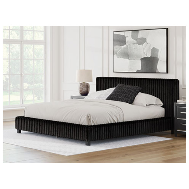 If casual and contemporary is your jam, you’re gonna love this king upholstered bed. Covered from head to toe in a luxuriously soft black corded fabric, it has a chic flair that's sure to wake up your inner sanctum’s style. We’re talkin’ relaxed refinement.
