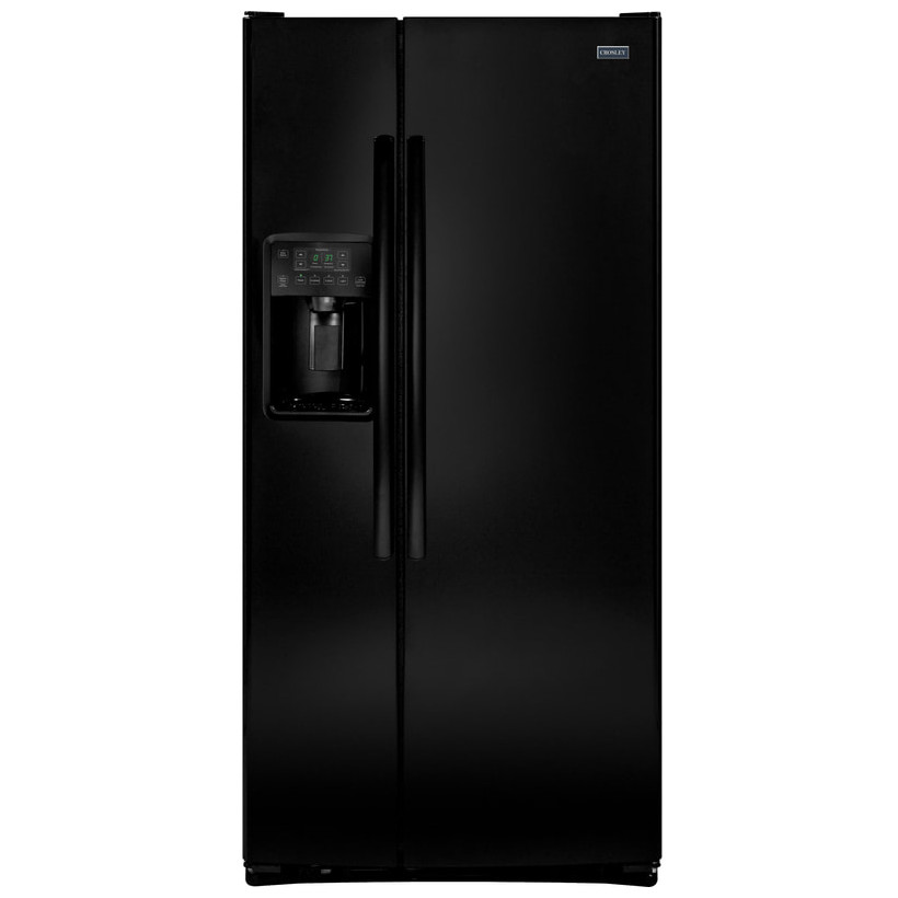 25.6 cf Side by Side Black Refrigerator with EvenTemp Cooling System, Adj. Glass Shelves, Clear Crispers, Dairy Compartment, (2) Clear Gallon Door Bins, (2) Clear 2L Door Bins, (2) Adjustable Wire Freezer Shelves, Internal Electronic Controls, LED Lighting, Energy Star. Image for illustration purpose only. Actual product may vary slightly.